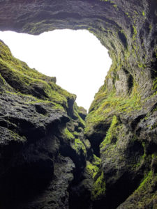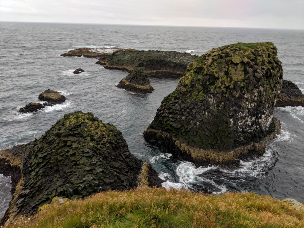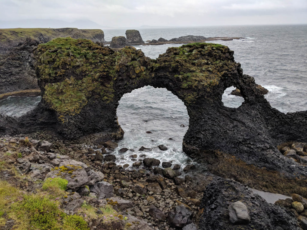 As we got on our way again, we didn’t have to drive very far to reach our next destination in Hellinar. Here there were many trails that brought you to the coast and cliffs overlooking sea stacks and arches. The arches were really neat because as you walked by the view changed and it looked like there were faces forming and staring at you. Can you see anything in the photo below?