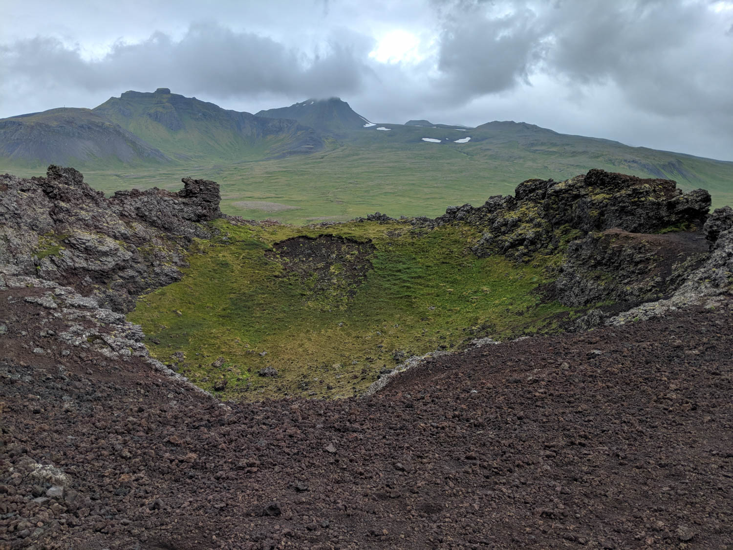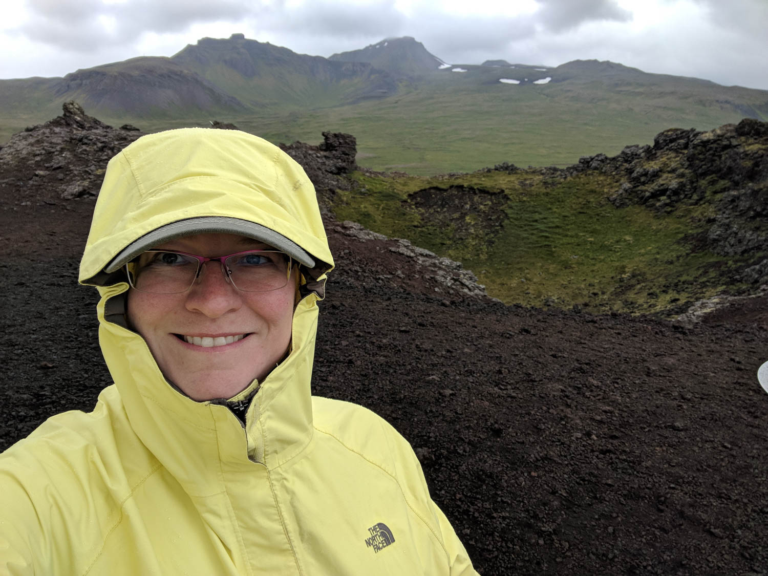 We pulled over at another impromptu stop and discovered this was Saxhóll Crater, which was formed about 3000 to 4000 years ago. There were stairs that ascended the side of the crater to the top and gave us a view of the mountains in one direction and the ocean in the other.