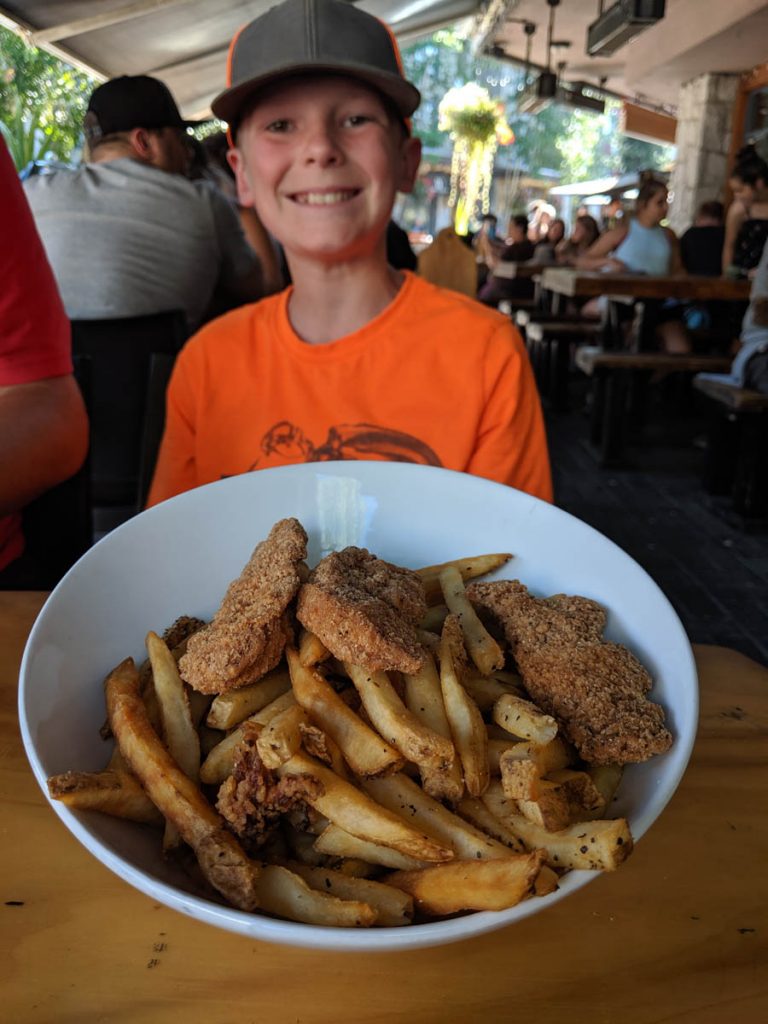 As we wandered around the village of Whistler looking for a place to eat, we came across El Furniture Warehouse. All meals were $5. Now being the skeptics that we are, we had to actually go check out the menu. Sure enough, every item on the menu was $5. Can’t go wrong with that price, so we waited to be seated and looked through the menu. Hayden went for the chicken fingers and fries and both Dan and I had a chicken burger. The bowl of Hayden’s food was MASSIVE! Good thing too as he was very hungry.