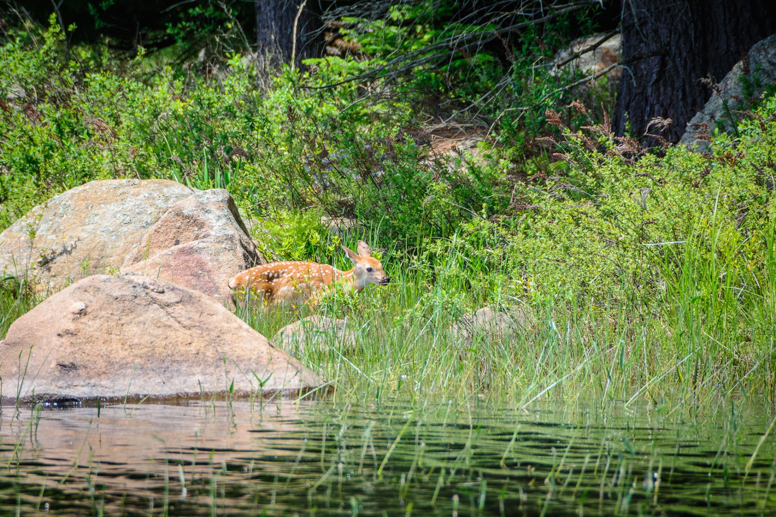 We headed out and within a couple minutes, spotted a mother and baby deer on the island in front of us, and we tried to get close enough so that Dan could get some pictures.  The baby was foraging in the water and mom was up in the trees.  We managed to get fairly close and they didn’t seem bothered by us at all.  Such a pleasure to see wildlife so close.  Plus the baby was cute!