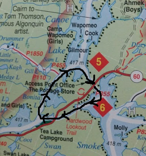 Once we were all packed up, we had to stop back at the East Gate. Dan has been collecting the t-shirts with all the different symbols (portaging, tenting, now looking for hiking). They finally had the shirt, but alas prices not in the system. We were told to come back later! Oh well. Later it will be. We headed then to Smoke Lake, where I knew we could canoe from Smoke, into Tea, into Canoe and then portage our canoe back to Smoke.