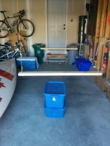 We placed these boards on our makeshift height measuring device (2 blue boxes and our cooler), which conveniently worked out to be about 3 feet off the ground. We had to use this height since we wanted to be able to hook our system to the wall and not have to pull ropes and adjust them for the correct height. It does mean that we have to load and unload the canoe when it is 3 feet off the ground and with the garage door partially open.