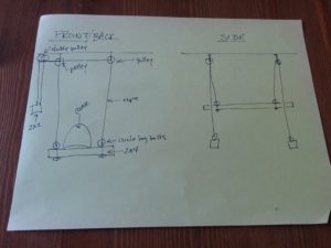 Now was the tricky part. We had to get the rope attached to the 2 by 2 so that it was level, and when we pulled on the system it would pull evenly and be able to hook on the angle brackets for storage.