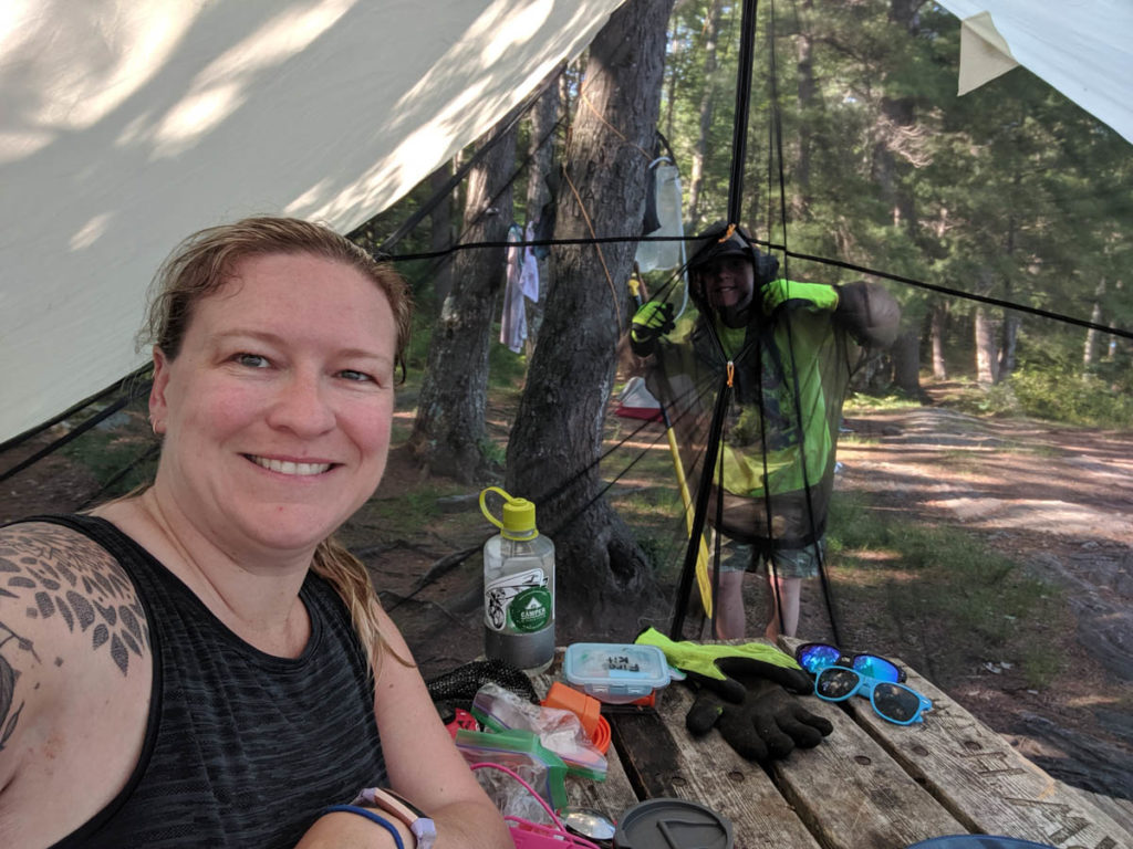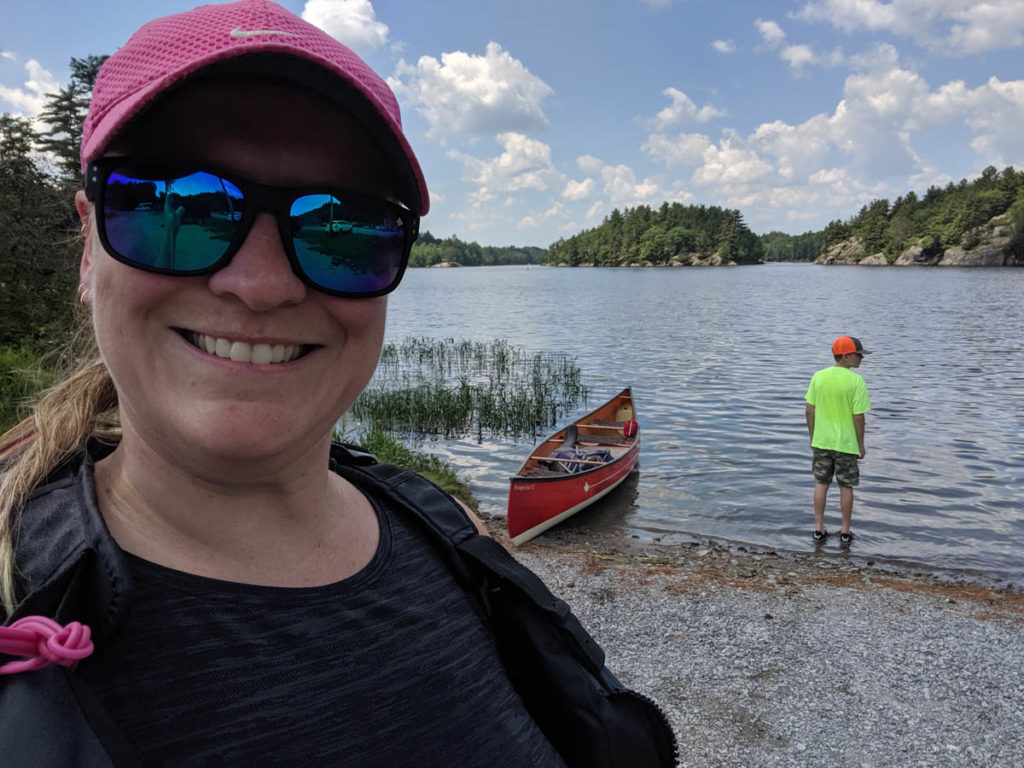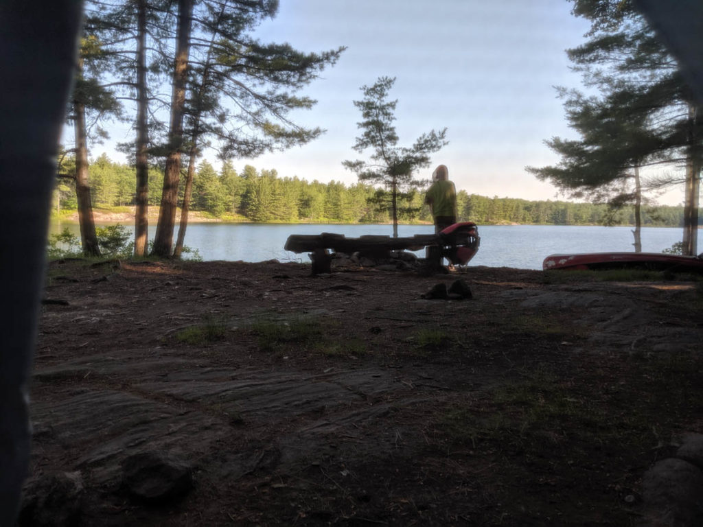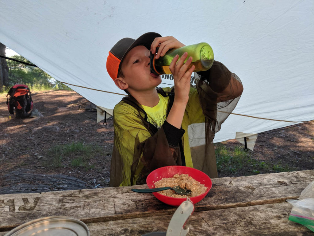 Hayden was his usual silly self and didn’t mind being out in the wild with the bugs as they don’t seem to bother him as much as they bother me. While I prepped my breakfast in the shelter, the water was just about ready for his oatmeal. Once everything was ready, it didn’t take us long to eat and then it was time to load the canoe.