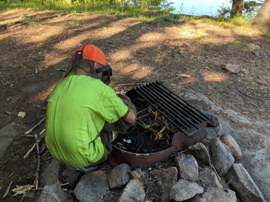 I decided to pack up the gear before breakfast as we both agreed that we would head home after eating. It was going to be another long morning of paddling and we had to get home in time for his soccer game that night. While packing up the gear, Hayden asked to start the fire again. We needed it to boil the water for oatmeal since I wanted to save the fuel for cooking my eggs. AGAIN, this kid would do an amazing thing – he started the fire with flint and steel and a cotton ball that was in our fire kit!
