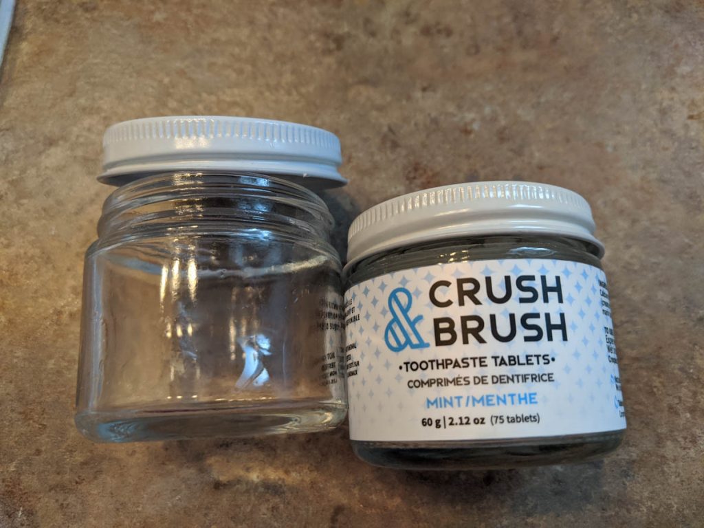 That brings me to this toothpaste product from Nelson Naturals, which are actually little tablets that you “Crush and Brush” with. The product comes in tiny glass containers that I will now up-cycle for other uses (like getting spices at the bulk store).
