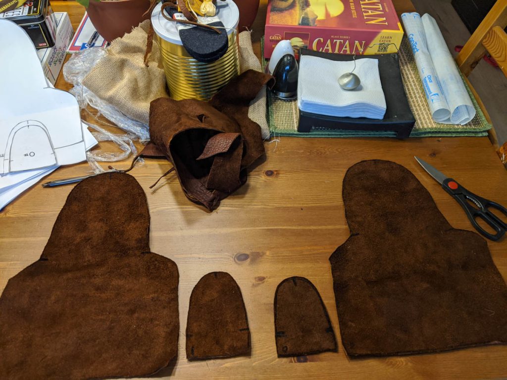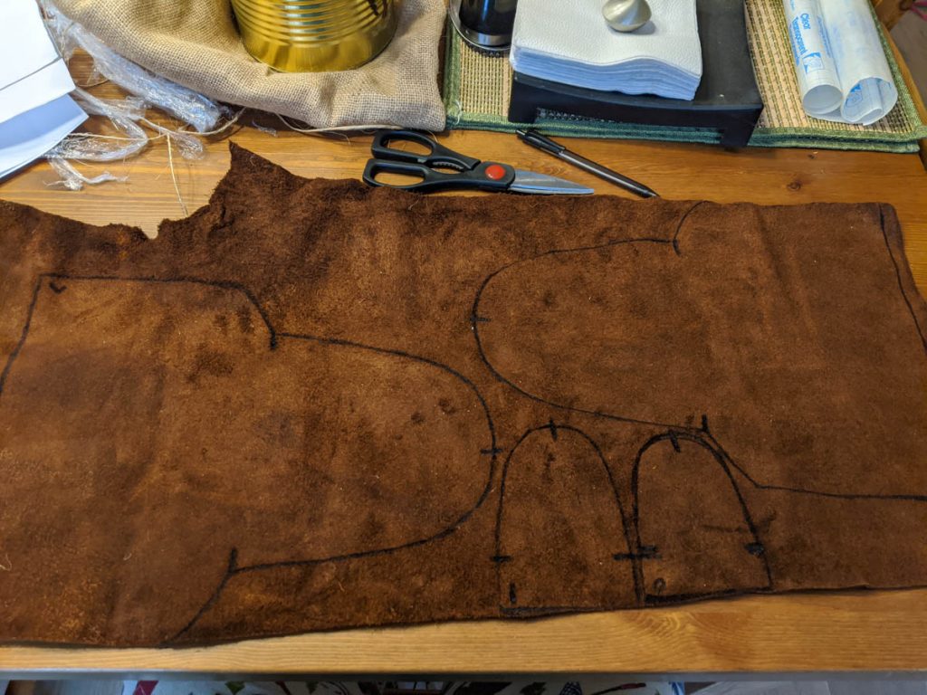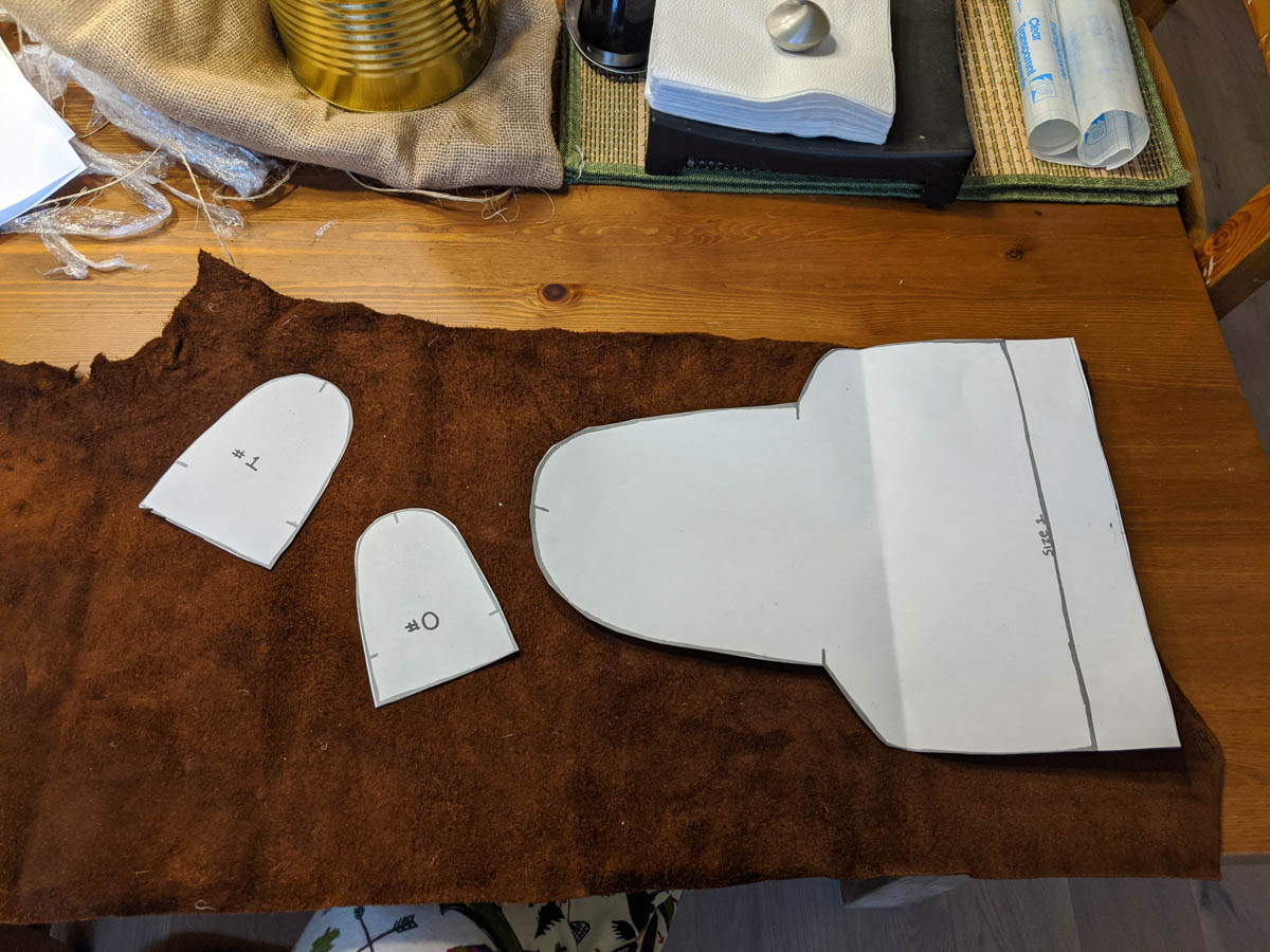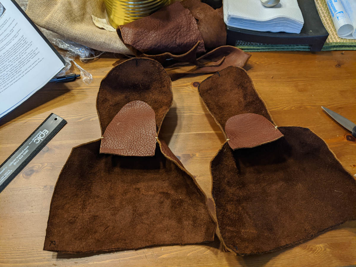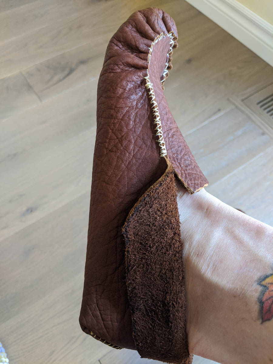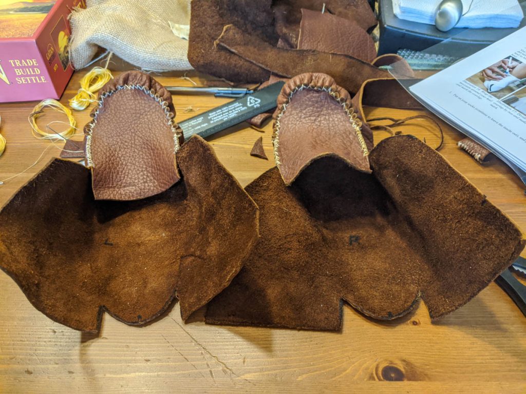 The back part of the moccasins were much easier to sew as it was a simple whip stitch. I added the holes for the laces and will enjoy wearing these around the house until camping begins.