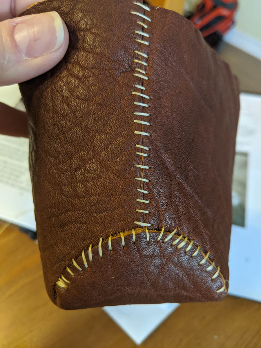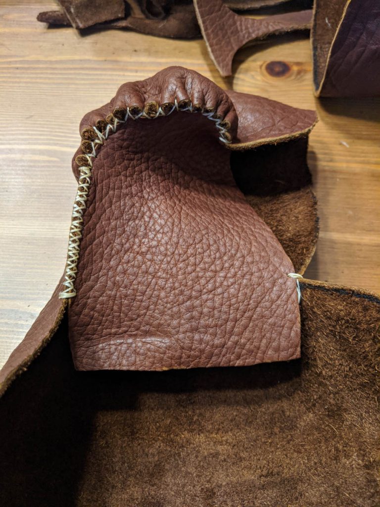 The first step was to tack the top parts of the moccasins to the bottom part. That was easy. Next came the PUCKERING part which was much more challenging and required carefully making each stitch and checking it before making the next. THEN you have to repeat going the other direction! – luckily, I am able to use both my right (dominant) and left hand for certain crafts, so I was able to switch hands when doing the second half.