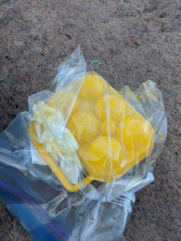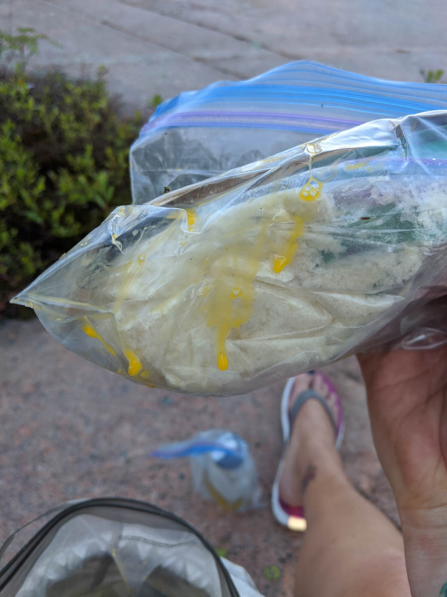 Disaster struck as I woke to prepare breakfast for us on Sunday morning. Inside the Ursack, a couple of the farm fresh eggs I had brought cracked open and oozed everywhere.