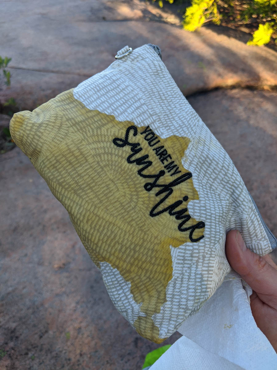 One thing with travelling with eggs, there is a possibility of breakage. The eggs had been in a hard container in a ziplock, but as we ate and moved items around we used the ziplock for other things and the eggs were just sitting on their own in the container. Lesson learned here: Make sure you double wrap the eggs, or just don’t use that bag for something else. The eggs had oozed over my new Thirty-One bag and all the other bags inside. At least everything else was wrapped and protected, but what a mess.