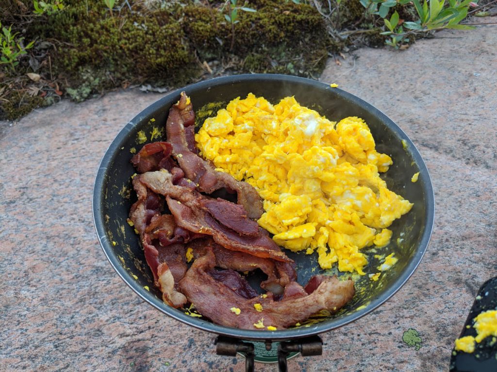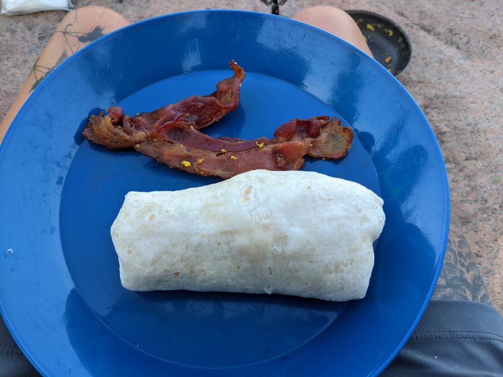 The morning started well with a beautiful sunny calm view from my tent. Then I went to prepare breakfast and found the egg disaster greeting me. Not much can be done but to clean up the mess as best as I could and continue with prepping the breakfast meal. Breakfast was cooked bacon warmed in the pan with scrambled eggs wrapped in tortilla shells and extra old cheddar.